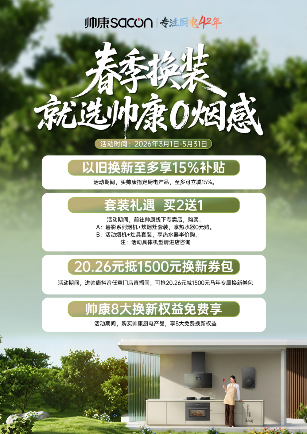 对于选购时常常纠结“油烟机怎么选”“灶具哪款好用”等问题的用户来说,帅康这套烟机灶具,不失为一个高性价比的选择。此刻正值2026年春季家装节,帅康更重磅推出“春季换装,就选帅康0烟感”多重换新礼遇: